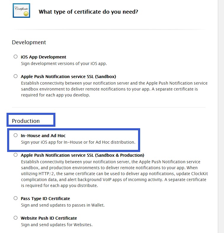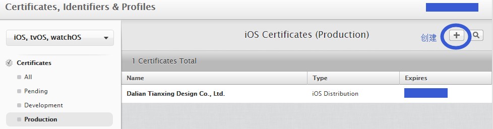 進入:Production(發布) 點擊右上角 + 進行證書添加