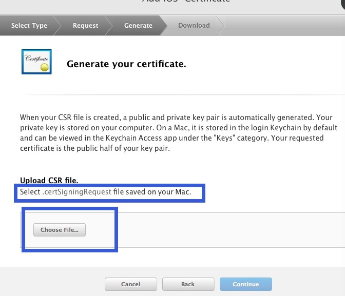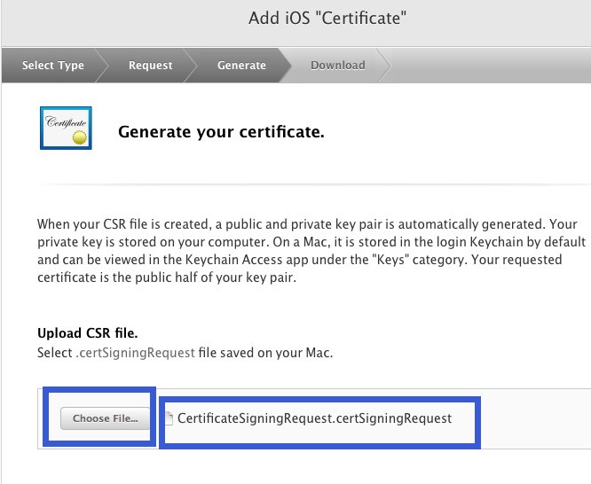 重回開發者界面:點擊“choose file”選擇剛才桌面上生成的鑰匙串配置文件