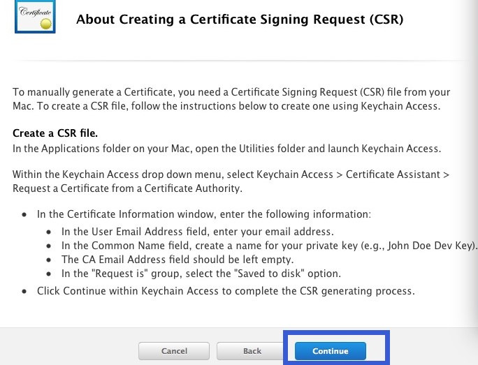 這一步,我們繼續點擊“Continue”。這一步是說,需要電腦的鑰匙串配置文件,稍后我會給大家說,所以我們先點擊“continue”,進入下一步。